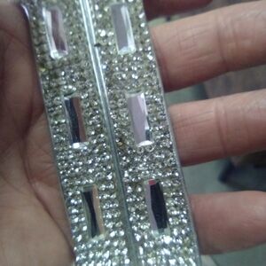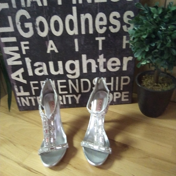 Lovely silver high heeled shoes with sparkly clear rhinstones.