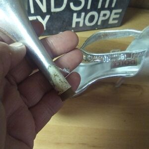 One shoe has the silver worn off the back & sides of the heel at the bottom. Perhaps you can get it fixed or cover it up with a silver marker or add a bow or other decoration to the back of each heel, etc.