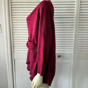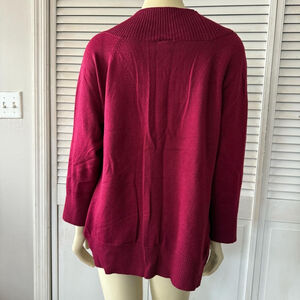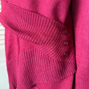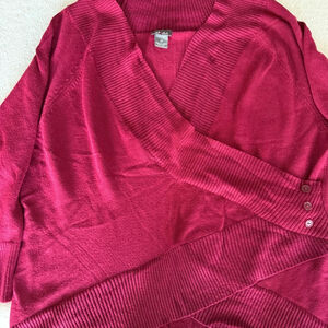 This is a pre-owned Dots brand sweater, size 3X. It is made of 94% acrylic and 6% polyester. The sweater features a surplice neckline and long sleeves with button details on the side. The garment is a solid burgundy color with ribbed detailing on the neckline and hem. The sweater measures approximately 24 inches across the chest and 27 inches in length. There are no visible stains, tears, or other imperfections.