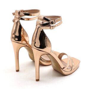 These women's Rose Gold high heel sandals feature a stiletto heel measuring 4.3 inches and a platform height of 0.2 inches. They have a solid pattern with a square toe shape and a buckle closure. The sandals have a double ankle strap for style and support, making them suitable for various occasions such as weddings, parties, casual wear, and business events. The upper material is polyurethane.