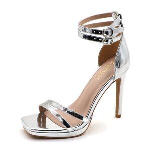 These women's high heel sandals feature a stiletto heel measuring 4.3 inches and a platform height of 0.2 inches. They have a solid pattern with a square toe shape and a buckle closure. The sandals have a double ankle strap for style and support, making them suitable for various occasions such as weddings, parties, casual wear, and business events. The upper material is polyurethane