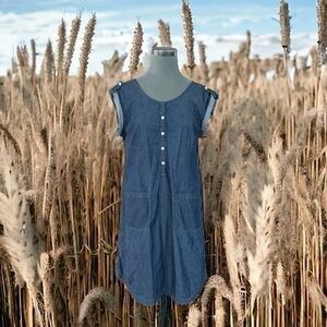 This #DenimDress is designed with #RollTabSleeves, adding a trendy touch to your wardrobe essentials. The #FrontPockets offer functionality without compromising style. Made from #100%Cotton, it promises comfort and durability. This #CasualDress is in very good condition, ready to be your new go-to for effortless style.