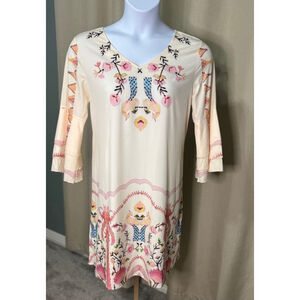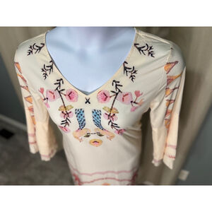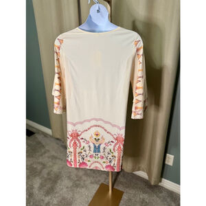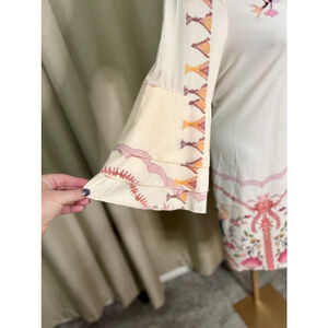 This is a women's dress, size L, new with tags. The dress is off-white with a floral and bird print in shades of pink, orange, and blue. The fabric is an easy care lightweight material perfect for packing light. It features a V-neck, three-quarter length bell sleeves with layered ruffles, and a knee-length, A-line silhouette. The dress measures approximately 36 inches in length and 19 inches across the shoulders. No visible imperfections are noted.