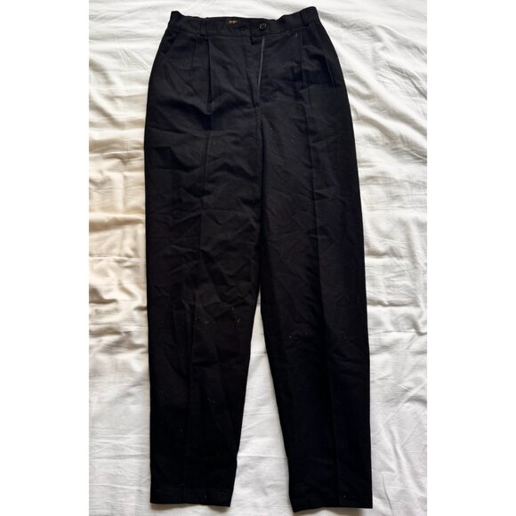 Pleated wool dress pants; Roomy through the thigh and tapered at the ankle. High-waisted