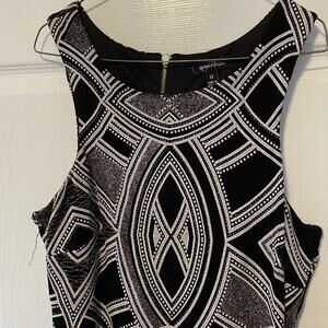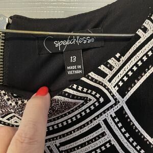 This stunning Speechless dress features a metallic geometric design that is sure to turn heads. The bodycon style and short length make it perfect for summer and spring wear, while the full back zipper provides both style and convenience. This dress is perfect for juniors or women, with a size 13 fit and sleeveless cut. The black color and metal accents add a touch of edginess, making it a great choice for a night out or special occasion.