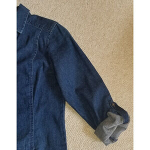 Women's Dress-J.JILL-DENIM-Amazing women's blue stretch denim chambray button-down shirt dress. Dress has a v- neckline with a collar, full front button closures, two front pockets, long sleeves and is not lined. 99% Cotton, 1% Spandex. Marked Size: PXS (Underarm-to-Underarm= 18 inches, Length= 35 1/2 inches). Excellent condition. Non-smoking home. Thanks for looking!