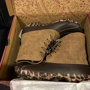 Stay stylish and dry with these brown duck boots. Perfect for outdoor adventures.
