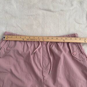 These Women's XXL Mauve Pink Cargo Pants are perfect for a casual day out or a travel adventure. The elastic waist and wide-leg style offer comfort and flexibility, while the light polyester material makes them ideal for warm weather. With plenty of pockets for convenience and a solid pattern in a dusty pink hue, these trousers are both stylish and practical for everyday wear. Vibe: Y2K street style, feminine utilitarian
