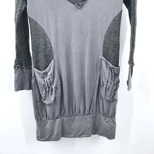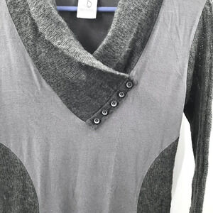 A cool piece from Dzhavael Couture, a great brand for lagenlook and artsy abstract clothing. Features a shawl collar and v-neck, and contrasting sweater knit material on the collar, pocket lining/sides of torso, and sleeves. Contrasting cuffs and torso in super soft grey stretchy knit material.