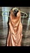This is a new with tags ELLIATT women's halter dress in a peach-colored satin-like fabric, size S. The dress features an asymmetrical design with a draped cowl neck and a high-low hemline that creates a flowing train on one side. The back is open with a zipper closure visible on the lower back. The fabric has a subtle sheen. The dress is shown both on a model and hanging, displaying its full silhouette.
