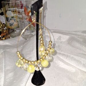 These women's earrings are very pretty. The hoops are 3" in diameter and have a round bead with rhinestones and some clear faceted beads that have some AB coating, Each one has two yellowish colored plastic beads that look like marbles. These have a very 70's - 80's Vibe.