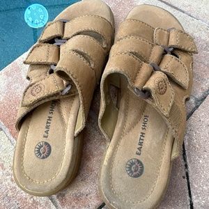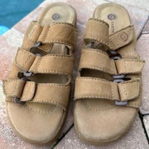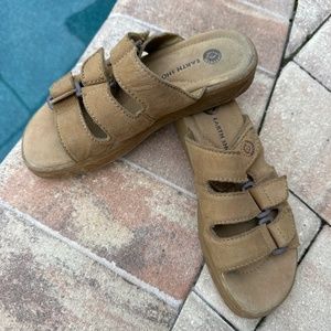 This Earth Shoe brand pair of slip-on neutral-colored sandals are as versatile as they are comfortable. Three adjustable Velcro fastened straps. Lightly padded inner soles that measure 9.5 “ long and 3.75” wide at their widest point. 1.5” high heel.