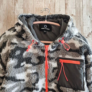 Pre-owned Ease of Motion brand fleece jacket, size M, made in China. Features a gray and white camouflage sherpa fleece upper section and a solid dark gray nylon lower section. It has a full zip closure with orange zipper and drawstring hood. The jacket includes a small zippered pocket on the upper left chest. The material is 100% polyester. The jacket shows no significant imperfections; condition is like new.