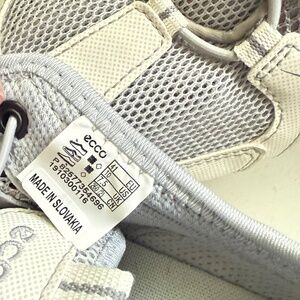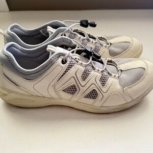 White pair of Ecco slip on sneakers, size 10. Can adjust tightness. Mesh detailing allows for breathability and comfort. Bought in Norway. In good condition.
