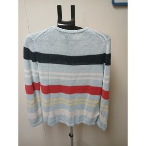This women's Eddie Bauer cardigan in size small features a striped pattern in blues, white, red, and yellow. Made from a ramie cotton blend, this vintage sweater has a crew neck and long sleeves, perfect for adding a pop of color to your outfit. With a 90s theme and all-season appeal, this cardigan is sure to become a stylish staple in your wardrobe.
