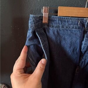 Stylish dark blue denim skirt with a relaxed fit. Ideal for everyday wear. Comfortable and versatile. It is a long skirt with a slit.