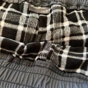 NWT - Fleece lined, pull-on, elastic waist with cord, pull on pants by Eddie Bauer. On front, two slash pockets, two zippered pockets On reverse, a zippered pocked., Elastic cuffs at ankle (not tight) Black plaid fleece lining,