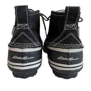 Women’s Eddie Bauer Hunt Pac Mid Boot in black. Features a full grain leather upper with a rubber & EVA outsole sole. Waterproof, seam-sealed with a vulcanized rubber shell. Gusted tongue with lace up design for superior fit & to keep elements out. Eddie Bauer signature logo on sides. Removable, molded EVA footbed. Rustproof hardware. Like new condition with little to no signs of wear. Size 7. Bundle to save big!