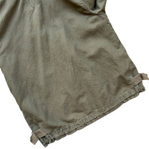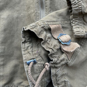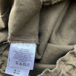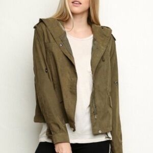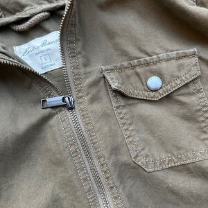 Pre-owned Eddie Bauer women's size small olive green hooded jacket. The jacket is made of a 51% linen and 49% cotton blend. It features a front zipper closure, a drawstring waist, and two front pockets. The hem and cuffs have adjustable straps. There is minor wear consistent with previous use. Measurements ptp is 20,flat