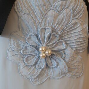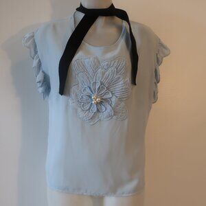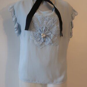 Womens Edward Achour Paris Blue Floral Print Pearl Design Blouse XL
