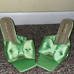 Womens Ego Adorable Satiny Green High Heel Mules With Bow