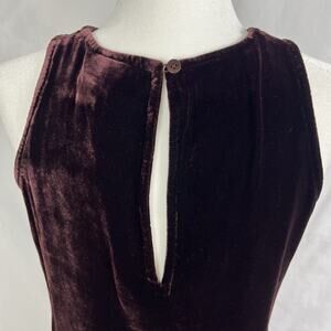 Shell top features velvet fabric, sleeveless, round neck, and keyhold back neck closure