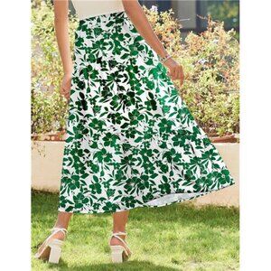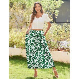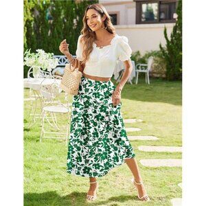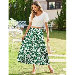 Women's Elastic High Waist A-Line Flowy Swing White Green