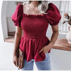 Women’s Elastic Puff Sleeve Ruffle Tunic Top Blouse Medium