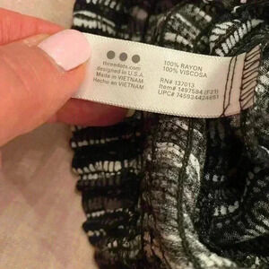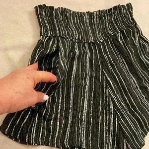 Comfortable striped black and white pull on shorts in excellent condition. No tears or stains. 100% rayon. Waist is stretchy.