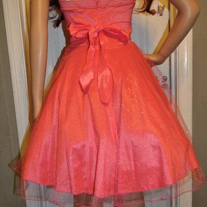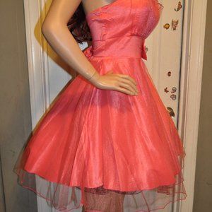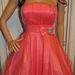 Women's Elegant Dress Mesh Strapless Party Prom Dress Bridesmaid A Line Stretch satin 100%polyester Made in US. Prom Party dress skirt, Shiny beaded sequins crystals, Elegant hidden zipper at the back tied at the waist to give you a better silhouette. inch measure. Size Large Bust 32/36 Waist 30/34 Length 37 Coral Color Accessories included