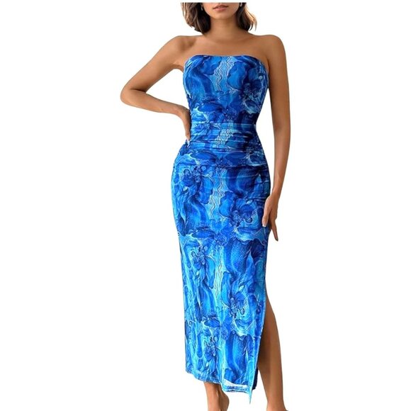 Womens Elegant Large Strapless Tube Top Blue Floral Bodycon Maxi Dress Party