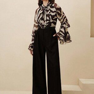 Women's Elegant Raglan Flare Sleeve Round Neck Semi-Sheer zebra print blouse
