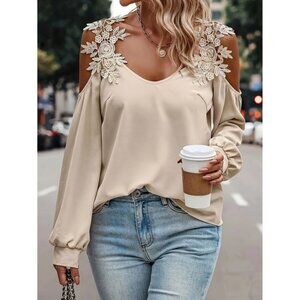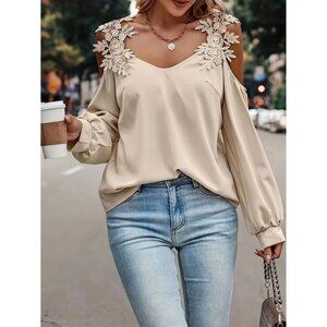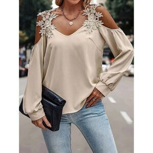 Women's Elegant V-Neck Off-Shoulder Long Sleeve Blouse with Floral Embroidery -