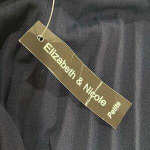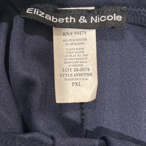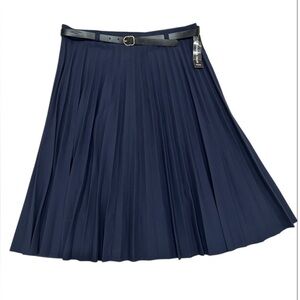 Elizabeth & Nicole belted pleated midi skirt. This navy blue skirt is made of 95% polyester and 5% spandex and features a black belt with a gold buckle.