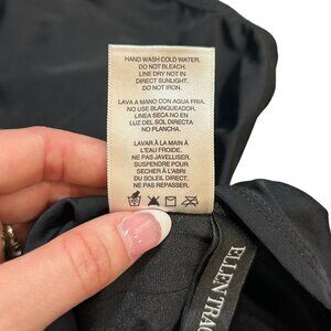 Women's Ellen Tracey One Piece Swimsuit. This item adds a fun spin on a summer basic staple that is a black swimsuit. The v neck style features ruffles for a feminine flare, with a halter neck tie in the back for adjustable comfort. There is ruching along the breast, and across the stomach for a flattering look. The bottoms are medium coverage.
