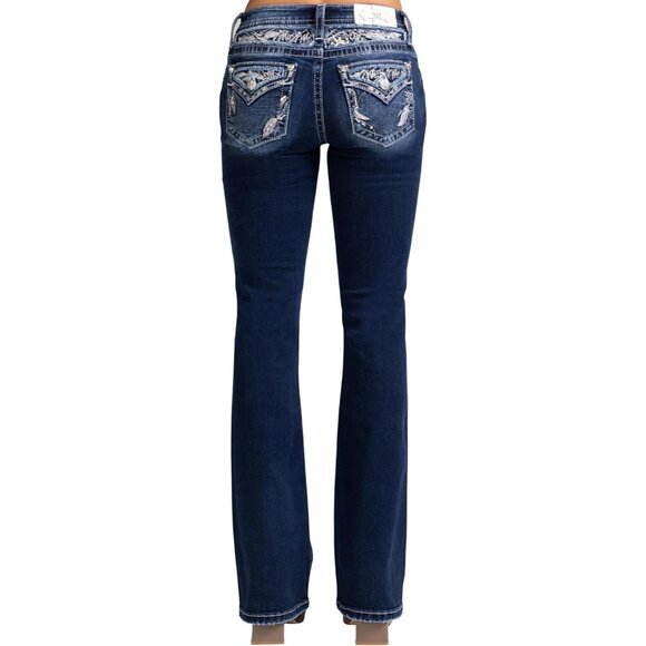 Women's Embellished Faux Flap Pockets Bootcut Jeans — a bold, stylish statement. Size: 28W x 34L. Color: Dark blue wash. Condition: Brand new, no flaws. Features: Flattering mid-rise with a relaxed fit, bootcut leg that gently flares for a balanced silhouette, and a trendy frayed detailing on both back pockets and waistband. Embroidered rhinestone logo with accents, rhinestone rivets, and a leather brand patch add luxe touches to this already eye-catching design. Made from 99% cotton and 1% elastane for just the right stretch and comfort. Easy to care for — machine washable. Measures: Front rise: 9 inches, Back rise: 14 inches, Inseam: 34 inches. Great for: Dressing up for nights out, adding some sparkle to casual weekends, or elevating your everyday denim game. Ships quick from a smoke-free home. Friendly seller — bundle to save!.