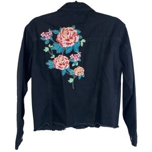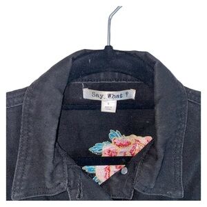 Say What Womens Denim Jacket Floral Black Embroidered Long Sleeve Size Small
