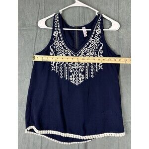 Women's Embroidered Exhilaration Blue White Tank Top Size Small S Zip Back. No holes or stains. Pre-owned condition. Measurements in photos. Smoke free home.