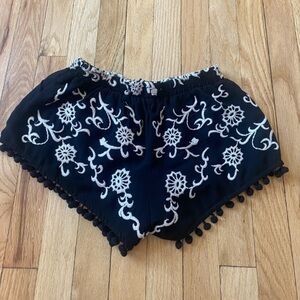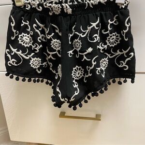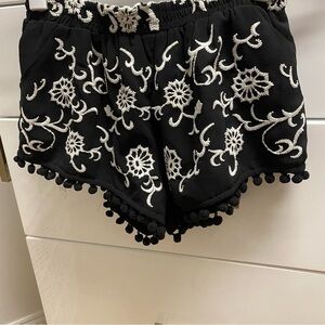 Cute Black shorts with white embroidered flowers, and pom pom trim. 100% Polyester
