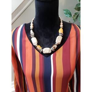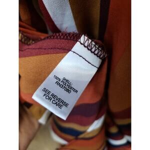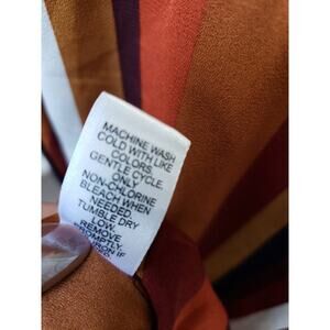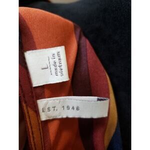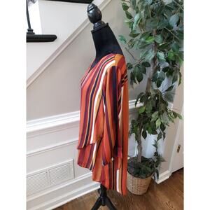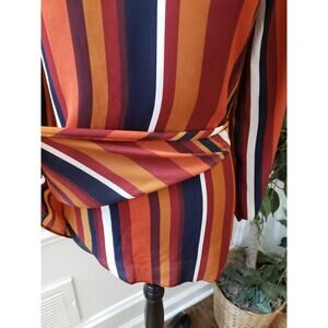 This Women's Est. 1946 long sleeve top in size L features vibrant horizontal stripes in shades of orange, maroon, purple, and white. The top has a modern fit with a flattering v-neck and is made from a soft polyester fabric. The unique detail of the knotted sleeves adds an interesting touch to the design. Perfect for casual outings, this top pairs well with jeans or skirts for a stylish and comfortable look.