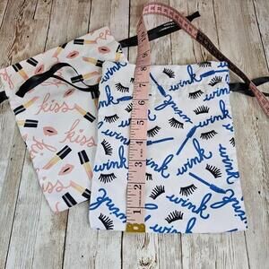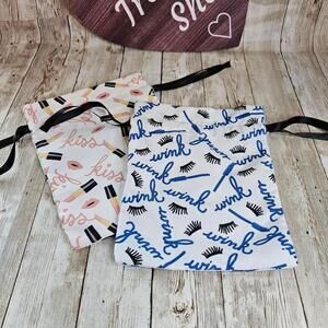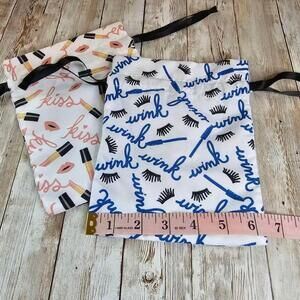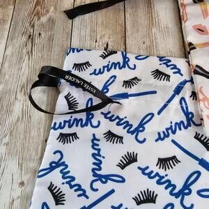 This is a set of two Estee Lauder makeup bags. The bags are made of a white cotton fabric with a blue and black eyelash print.. The bags are in new condition and have never been used.