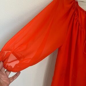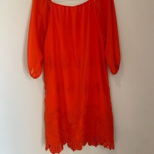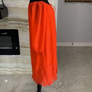 Women’s Eva Mendez Size S Orange Soft Chiffon Over A Thin Slip Dress. Adorned with matching lace as Bottom Trim.