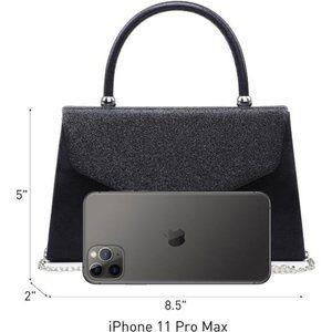 DESIGN: Elegant evening bag / party clutch for women, top round handle. Frosted with glistening sheen on the front flap, detachable chain strap, lining with a slip pocket. The evening purse has just the right amount of bling and glitter the evening with its beautiful make.