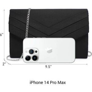 High quality feeling velvet body framed by silver-tone hardware with removable silver chain strap.