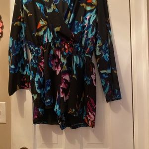 Black romper with blue, green and pink floral. Design Lab designer. Perfect for evening attire. Size Large. Gently used.