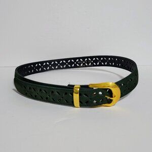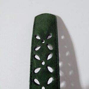 Enhance your wardrobe with this women's genuine suede leather belt in a beautiful evergreen color, a stylish and versatile accessory that adds a touch of elegance to any outfit. This belt, sized as L, fits comfortably around a 38-39 inch waist, ensuring a snug fit for your dress or casual attire. Crafted from premium suede leather, it boasts a charming solid green hue that complements a wide range of colors. Featuring an attractive gold tone buckle and a unique laser-cut-out design with a floral theme, this dress belt from an unspecified brand exudes sophistication with its adjustable style, making it perfect for both formal and casual occasions. Proudly made in the USA, this belt is a testament to quality craftsmanship, keeping your wardrobe chic and on-trend. The belt is in excellent pre-owned condition! It shows very few signs of wear and still has a lot of life left in it! Comes from a smoke-free home.