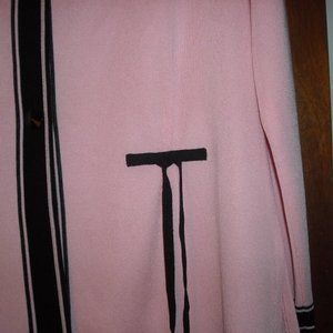 The color of the sweater jacket top is a pretty pink shade with black and pink trim.