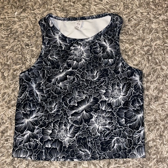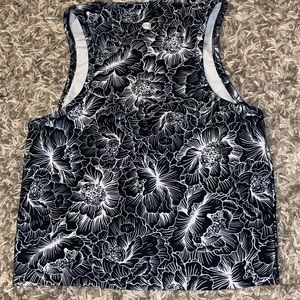 Navy blue and white floral exercise tank top/muscle tee for women. Stretchy and comfortable.