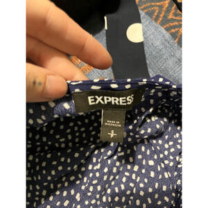 This is a pre-owned Express dress, size S. The dress features a navy blue color with a white polka dot pattern. It has a V-neck and short sleeves. The dress has a wrap design with a tie at the waist. The material appears to be lightweight. There are no visible stains or tears. Made in Indonesia.