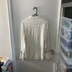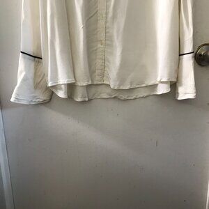 Women's western-style button-down shirt. Only worn a few time. In GREAT condition. No stains or tears on it. Color is off-white or egg shell. Has brown piping around the front and on the sleeves. Material is listed as 100% rayon. Measurements can be found below.